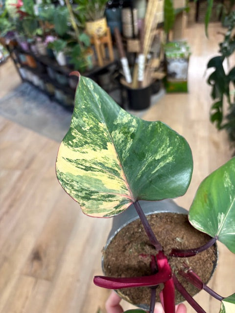 A Philodendron 'Strawberry Shake' az egyik legkeresettebb és leglátványosabb philodendron. Ez a növény a Philodendron erubescens egy tarka (variegata) hibridje, és a nevét a lenyűgöző színkavalkádjáról kapta, ami a fehértől a krémszínen és a sárgán át egészen a mélyvörösig és a málnarózsaszínig terjed.