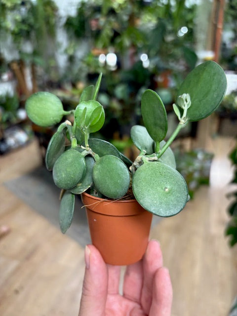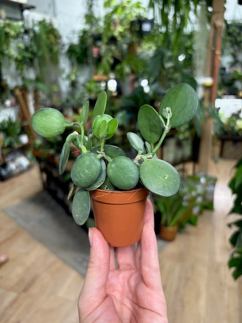 Szárain végig sorakoznak tökéletesen kerek, húsos levelei. A friss hajtások mind élénk zöldek, míg az idősebb levelek sötét mély árnyalatúak, felületük púderes ezüstös.